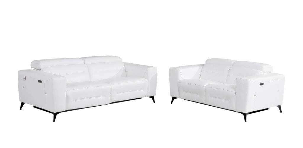 Experience comfort and sophistication with the Global United 989 Power Reclining 2PC Sofa set by Divanitalia. This modern series combines contemporary style with timeless elegance. Meticulously crafted with attention to detail, it's design features a sleek art deco-inspired silhouette and luxurious Top-Grain Italian Leather upholstery. Its elegant Jet black-finished stainless steel legs add a touch of modern sophistication. Combined with plush high density foam cushioning and its 2-way powered reclining seats and headrests, the 989 series provides the ultimate comfort and relaxation experience. Perfect for hosting movie nights or relaxing evenings, transform your entertainment space into a sanctuary of style and comfort with the 989 Sofa.